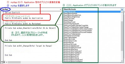クラスモジュールの宣言セクションに、Application 型のオブジェクト変数を定義すると、オブジェクトボックス(② の部分)で、定義した変数を選択できるようになります。選択すると、プロシージャボックス(③ の部分)に、イベントが表示されます。